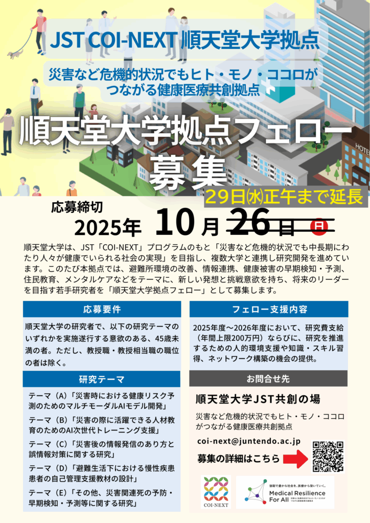 JST COI-NEXT「順天堂大学拠点フェロー」大募集!(〆切延長:10月29日㈬正午まで)